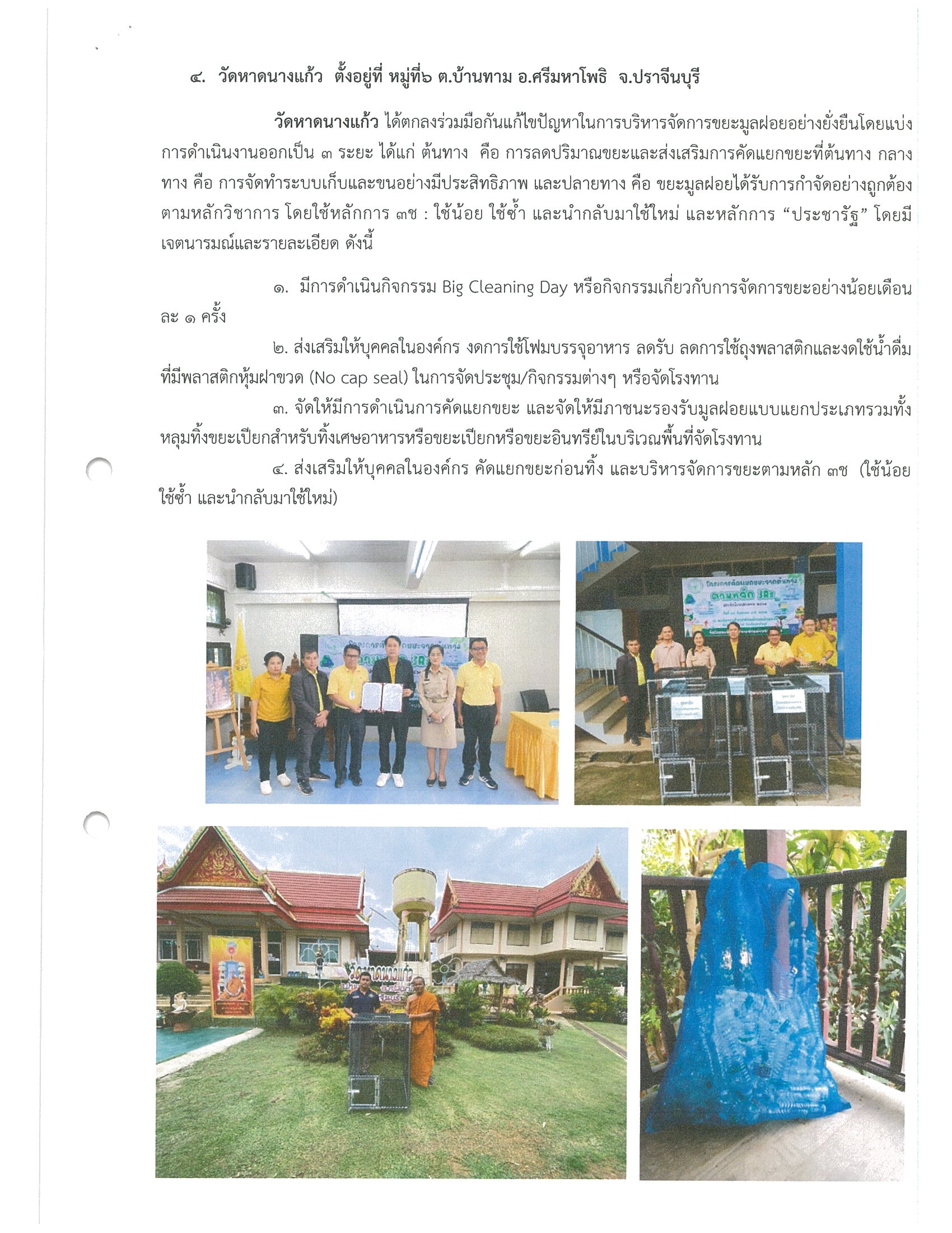 วัดหาด นางแก้ว ได้ตกลงร่วมมือกันแก้ไขปัญหาในการบริหารจัดการขยะมูลฝอยอย่างยั่งยืน โดยแบ่งการดำเนินงานออกเป็น 3 ระยะ ได้แก่ ต้นทาง คือ การลดปริมาณขยะและส่งเสริมการคัดแยกขยะที่ต้นทาง กลางทาง คือ การจัดทำระบบเก็บและขนอย่างมีประสิทธิภาพ และปลายทาง คือ ขยะมูลฝอยได้รับการกำจัดอย่างถูกต้อง ตามหลักวิชาการ โดยใช้หลักการ 3ช : ใช้น้อย ใช้ซ้ำ และนำกลับมาใช้ใหม่ และหลักการ “ประชารัฐ” โดยมีเจตนารมณ์และรายละเอียด ดังนี้