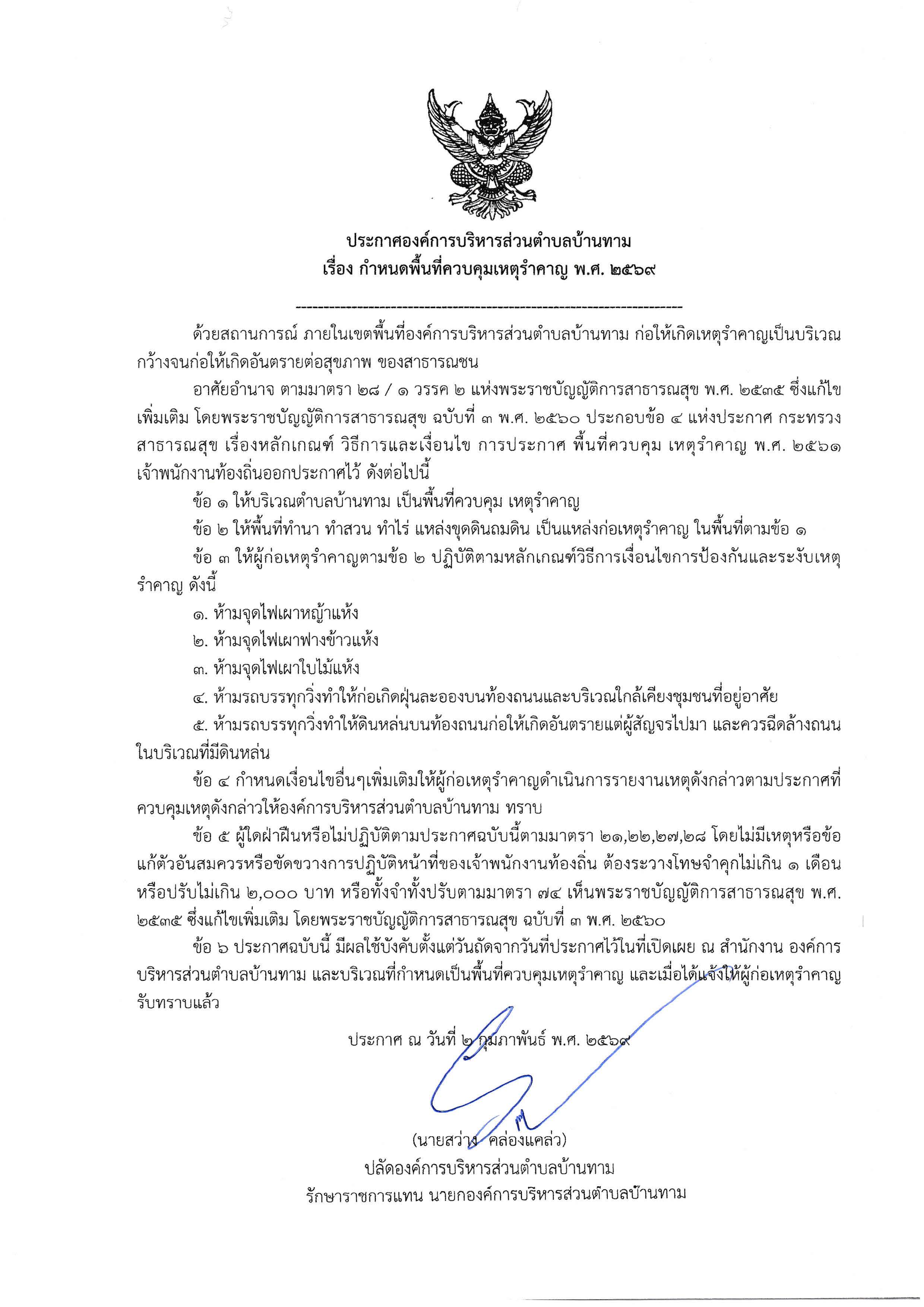 ประกาศ อบต.บ้านทาม เรื่อง กำหนดพื้นที่ควบคุมเหตุรำคาญ พ.ศ.2569